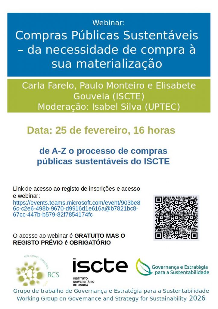 No dia 25 de fevereiro de 2026, o Grupo de Trabalho em Governança e Estratégia para a Sustentabilidade promove mais um webinário dedicado ao tema das compras públicas sustentáveis, desta vez tirando partido da experiência do ISCTE, a quem o GT agradece a colaboração e a disponibilidade para a partilha com a comunidade.